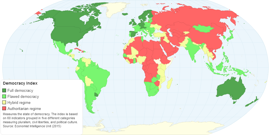 The EIUs Democracy Index measures the state of democracy by rating electoral processes and pluralism the state of civil liberties the functioning of government political participation and political culture in more than 160 countries worldwide. Click on a country name below to access the full country narrative report. The EIU Democracy Index provides a snapshot of the state of world democracy for 165 independent states and two territories.